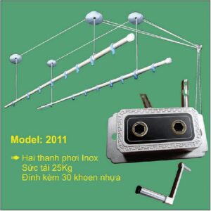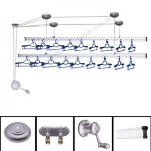 Bộ linh kiện bao gồm: 1 Bộ tời, 1 Dẫn hướng, 4 Buli(Dòng dọc), 2 Thanh phơi, Cáp giàn phơi (dài 6m).